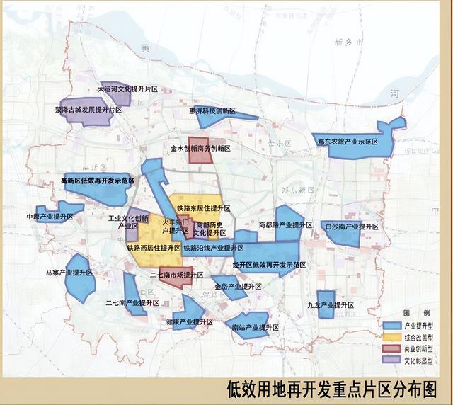 產業提升型:惠濟科技創新區、鄭東農旅產業示范區、高新區低效再開發示范區、中原產業提升區、馬寨產業提升區、二七南產業提升區、健康產業提升區、南站產業提升區、鐵路沿線產業提升區、金岱產業提升區、經開區低效再開發示范區、九龍產業提升區、商都路產業提升區、白沙南產業提升區。